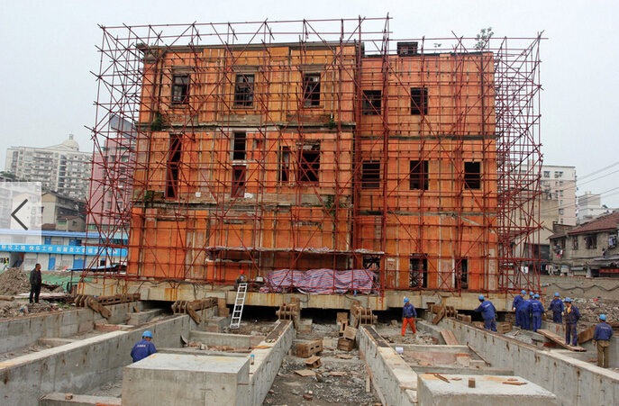 據(jù)了解,建筑物年代久遠(yuǎn),為了保證移動(dòng)時(shí)不散架,必須要求基礎(chǔ)的加固工程做得更細(xì)致。水泥托盤是在房屋地基被掏空后,用液壓千斤頂將小樓抬高1.4米,用鋼筋混凝土澆筑而成。這樣,平移時(shí)的受力點(diǎn)也都在“托盤”上,而不在樓體建筑上。經(jīng)過反復(fù)推算,后將平移速度設(shè)置在每小時(shí)70厘米。
