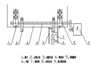 導繩器在有繩槽的卷筒上,隨卷筒轉動而作軸向移動,以保證鋼絲繩在卷筒上排列整齊。當?shù)蹉^上升到級限位置時(吊鉤外殼與卷筒外殼之間的離距應≥500mm),導繩器裝置的卡板磁撞右停止塊,推動限位桿往右移動,從而切斷電機電流。當?shù)蹉^下降到極限位置時。導繩器裝置的卡板碰撞左停止塊,推動限位桿往左移動,從而切斷電機電流,這樣確保的電動葫蘆安全行。導繩器裝置和限位裝置示意圖見圖10。
