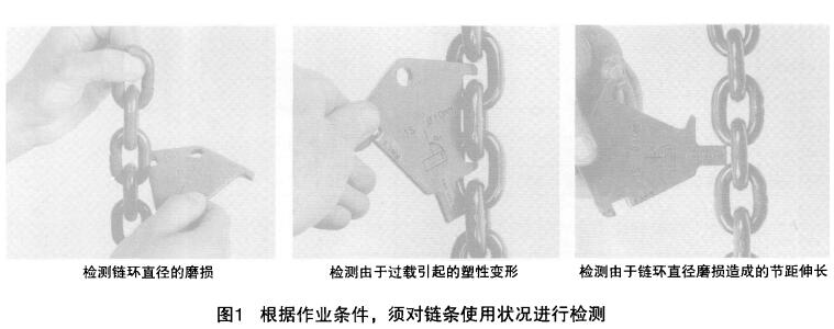 (3)檢查鏈環(huán)磨損及伸長:用生產(chǎn)廠商提供的標(biāo)牌進行簡單檢測 (見圖1 ) 。