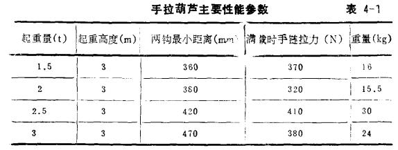 手拉葫蘆亦稱到倒鏈葫蘆,是一種最普遍的手動提升工具。根據不同工程對象,手拉葫蘆可在12m起重高度范圍選擇合適長度的環(huán)鏈。在爬升模板中常用的手拉葫蘆,其主要技術參數如表4-1所示。