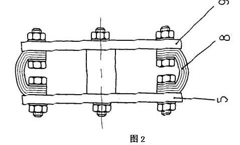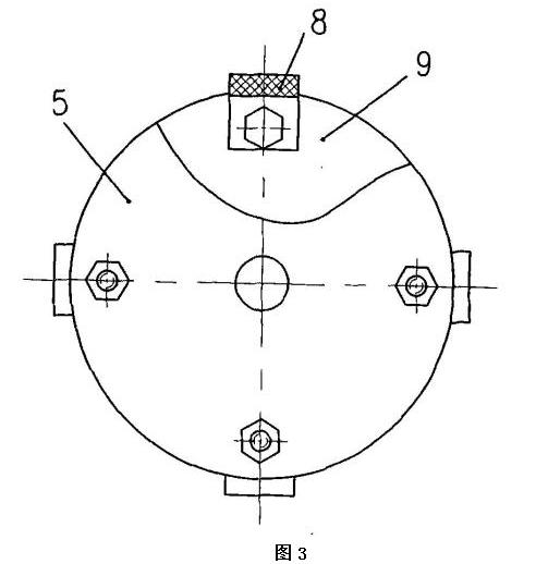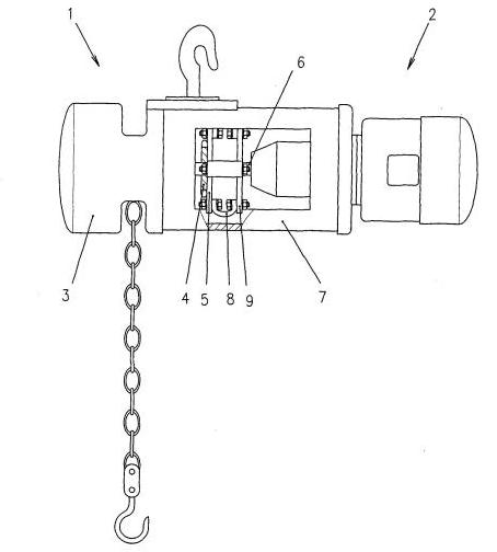 該電動(dòng)葫蘆采用獨(dú)特的設(shè)計(jì),利用手拉葫蘆和煤電鉆相結(jié)合,其手拉葫蘆的手拉轉(zhuǎn)輪上沒有纏繞搭接手拉鏈,煤電鉆包括機(jī)殼和卡裝在煤 電鉆的卡具上的鉆桿,手拉轉(zhuǎn)輪與鉆桿同軸設(shè)置,手拉轉(zhuǎn)輪朝外的端面朝向煤電鉆,殼體和機(jī)殼采用固定架固定相連,手拉轉(zhuǎn)輪朝外的端面上固定有手拉轉(zhuǎn)輪法蘭盤,手拉轉(zhuǎn)輪法蘭盤上均布有多個(gè)螺栓孔,每個(gè)螺栓孔處采用緊固件分別與一個(gè)皮帶條的一端固定相連,每個(gè)皮帶條的另一端通過鉆桿法蘭盤上的螺栓孔采用緊固件連接固定在鉆桿法蘭盤上,鉆桿法蘭盤上的螺栓孔位置與手拉轉(zhuǎn)輪法蘭盤上的螺栓孔位置對(duì)應(yīng),鉆桿法蘭盤安裝固定在鉆桿的端頭上。在使用時(shí),當(dāng)需要起吊重物時(shí),可利用煤電鉆的電機(jī)帶動(dòng)鉆桿按照需要的方向旋轉(zhuǎn),鉆桿就會(huì)通過鉆桿法蘭盤、多個(gè)皮帶條8和手拉轉(zhuǎn)輪法蘭盤帶動(dòng)手拉葫蘆的手拉轉(zhuǎn)輪按照需要的方向轉(zhuǎn)動(dòng),從而完成對(duì)重物的起吊。由于采用皮帶條這種軟連接設(shè)計(jì)將煤電鉆的電機(jī)產(chǎn)生的扭矩傳遞到手拉葫蘆的手拉轉(zhuǎn)輪,保證了手拉葫蘆轉(zhuǎn)動(dòng)的平穩(wěn)性,再由于煤電鉆的輸出轉(zhuǎn)速較低,不需要另加減速裝置,故本發(fā)明的利用手拉葫蘆和煤電鉆改造成的電動(dòng)葫蘆的結(jié)構(gòu)非常緊湊,體積也較小,尤其適宜井下機(jī)電硐室起吊、裝卸設(shè)備和物件、以及安撤面使用,并可降低工人勞動(dòng)強(qiáng)度,提高工作效率。