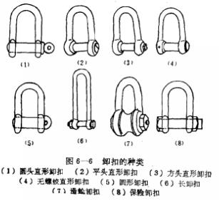 1、圓頭卸扣:這種卸扣的銷的端部,有一種圓形的銷柄(圖6-6),不用器械科徒手加一扣合合卸脫,使用較為方便,故在漁具上普遍使用。如漁船船尾的拽引裝置與拽崗的連接,水上部分構(gòu)件件的連接均用此類卸扣。但該卸扣不宜用于拽綱間的連接,以免在放絞拽綱時,突出的銷柄與其他屬具發(fā)生掛鉤。圓頭卸扣的銷柄環(huán)眼處,可貫穿保險鉛絲與卸扣本體縛住,以防止栓的脫落。為防止生銹和便于卸脫,在其螺紋部分需涂以牛油。