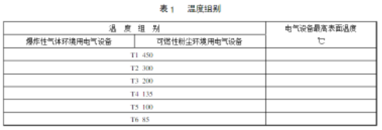 II類和粉塵類防爆葫蘆電氣設(shè)備的極限溫度分組,見表1