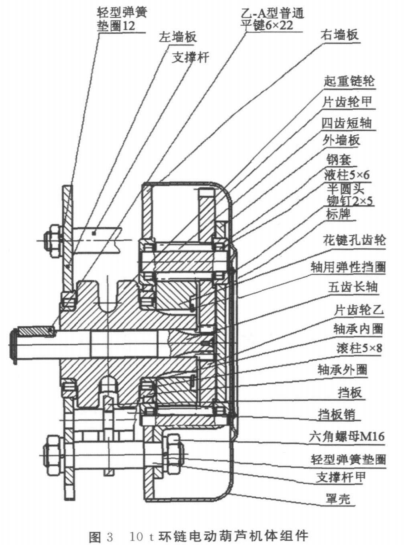 葫蘆機(jī)體的組件圖樣如圖3所示,其中齒輪傳動(dòng)采用2組對稱排列的二級直齒圓柱齒輪傳動(dòng)。I級和II級齒輪傳動(dòng)具有相同的實(shí)際中心距。