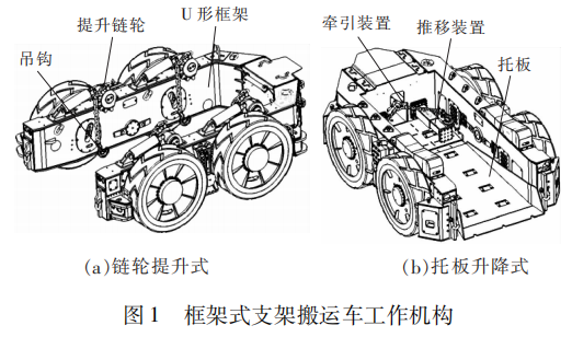 框架式支架搬運(yùn)車(chē)主要用來(lái)拖運(yùn)支架,如圖1所示,其工作機(jī)構(gòu)是基于U形框架的鏈輪提升式(或托板升降式)支架裝載機(jī)構(gòu)。鏈輪提升式機(jī)構(gòu)是利用4 個(gè)吊鉤鉤住支架起吊環(huán),通過(guò)操作提升鏈輪動(dòng)作實(shí)現(xiàn)支架的提升裝載。倘若U形框架內(nèi)寬設(shè)計(jì)較窄,待支架進(jìn)入框架時(shí),支架兩側(cè)剩余空間較小,增加了工人的掛鉤難度,影響了支架的裝卸速度;另外,倘若提升鏈輪的離地高度設(shè)計(jì)較高,待支架進(jìn)入框架時(shí),壞損支架的側(cè)護(hù)板處于張開(kāi)狀態(tài),張開(kāi)的側(cè)護(hù)板極易與提升鏈輪發(fā)生碰撞,阻礙支架進(jìn)入框架,同樣影響了支架的裝載速度。托板升降式機(jī)構(gòu)的裝卸架原理是在裝架時(shí)落下托板,利用牽引裝置將支架牽引至框架內(nèi),卸架時(shí)利用推移裝置將支架推出框架,以此實(shí)現(xiàn)支架的裝卸。倘若在使用過(guò)程中,托板滾輪卡滯,加之牽引裝置繩力設(shè)計(jì)有限,則會(huì)導(dǎo)致裝架困難;倘若推移裝置推出時(shí),其導(dǎo)向套筒發(fā)生變形別卡,則會(huì)導(dǎo)致卸架困難,進(jìn)而影響了支架搬運(yùn)車(chē)的作業(yè)效率。
