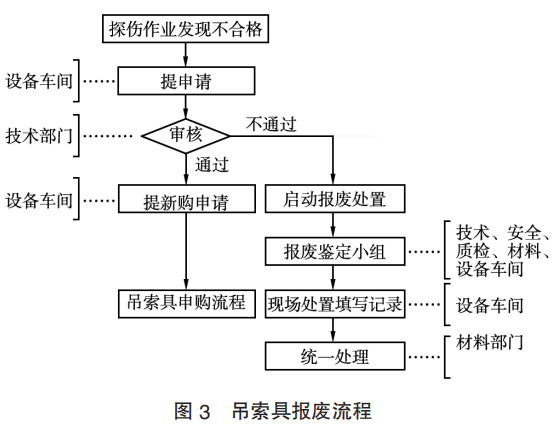 當(dāng)探傷發(fā)現(xiàn)有不合格吊索具時,由設(shè)備車間提報報廢申請,報技術(shù)部門審核,通過后設(shè)備車間組織報廢鑒定小組進行現(xiàn)場處置并填寫臺賬記錄,同時由材料部門處置并新購。