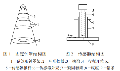 固定鐘罩部分如圖1所示。它由鼠籠型鐘罩架、環(huán)形擋板、橫梁等組成。橫梁起固定傳感器推桿的作用。固定鐘罩做成鼠籠型主要是為了保持測試裝置的平衡,避免傾斜影響測試效果。