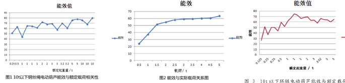 在對不同規(guī)格,不同型號的環(huán)鏈電動(dòng)葫蘆的能效值進(jìn)行對比的同時(shí),還收集了同1臺葫蘆在從輕載到額載工況下,能效隨試驗(yàn)載荷變化而變化的試驗(yàn)數(shù)據(jù)。經(jīng)過對數(shù)據(jù)的分析,圖2列舉了一臺5t的雙速環(huán)鏈電動(dòng)葫蘆能效隨載荷變化的變化曲線,此曲線具有廣泛代表性。根據(jù)曲線趨勢,可得出以下結(jié)論,鋼絲繩電動(dòng)葫蘆在吊載不足30%額定起重量的載荷時(shí),其能效值很低,大量能量均被浪費(fèi),當(dāng)?shù)踺d重物超過30%額定起重量的載荷時(shí),電動(dòng)葫蘆的能效值會(huì)有顯著提升,并逐漸趨于高能效值,直至吊載重物超過50%額定起重量,能效值變化非常微小,趨于穩(wěn)定。