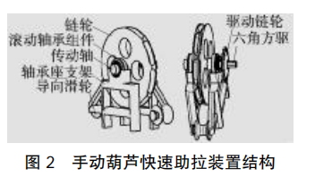 手拉葫蘆快速助拉裝置可以固定手拉葫蘆的手拉鏈條,給手拉鏈條提供拉力以提升重物,驅(qū)動(dòng)力可通過鏈輪外接電機(jī),也 可以通過內(nèi)六角接頭外接氣動(dòng)扳手。 該裝置由鏈輪、滾動(dòng)軸承組件、傳動(dòng)軸、軸承座支架、導(dǎo)向滑輪、驅(qū)動(dòng)鏈輪和外六角方驅(qū)組成(圖 2)。