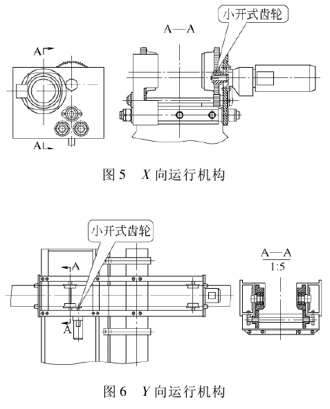 X、Y運行機(jī)構(gòu)采用H型鋼運行軌道,為解決輪壓分布不均勻,易打滑的現(xiàn)象,車輪采用小開式齒輪—+同步開式齒輪裝置傳動的形式,運行機(jī)構(gòu)采用三合一減速電動機(jī),結(jié)構(gòu)簡單,運行平穩(wěn),安全可靠。X、Y運行機(jī)構(gòu)見圖5和圖6。