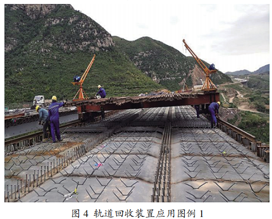 該軌道回收裝置用于鋼混橋梁架橋機架設完畢后,架橋機的軌道回收,利用旋轉中心軸、第一旋轉托盤和第二旋轉托盤可實現(xiàn)吊具的360毅旋轉作業(yè),作業(yè)方便快捷,使用安全可靠,操作易控制,自重輕、施工快速,避免了物品回收時的人工轉運時耗,有利于施工成 本的節(jié)約?;喌蹉^裝置通過定滑輪、起吊電動葫蘆和 鋼絲繩作用,可實現(xiàn)架橋機軌道的高效回收。與現(xiàn)有技術相比,該應用于鋼混橋梁安裝架橋機 軌道回收裝置的設計結構簡單、使用方便快捷、安全可靠、易控制和成本低,采用該回收裝置規(guī)避了傳統(tǒng)人工進行軌道回收的耗時且效率低下問題;提升了架橋機軌道回收的效率;規(guī)避了人工回收軌道的安全隱患;快捷方便且縮短了鋼混橋梁的架設工期。