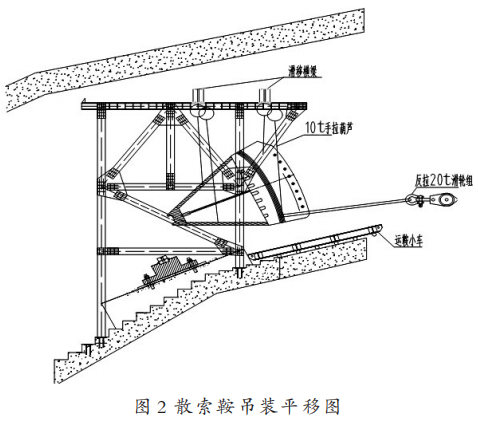 第一,利用大噸位汽車吊將散索鞍放置在隧道口的運鞍小車上,洞口反拉卷揚機預緊受力。使用多個5t手拉葫蘆使鞍體與運鞍小車固定,并在運鞍小車上焊接限位進一步固定鞍體。