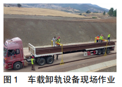 從設(shè)備的耐用性出發(fā),設(shè)備需要結(jié)構(gòu)簡(jiǎn)單,操作簡(jiǎn)單,維修方便,制作維護(hù)成本低,從設(shè)備的安全性出發(fā),設(shè)備需要滿足長(zhǎng)途運(yùn)輸過(guò)程中自身不脫落車(chē)體,并且滿足在裝卸鋼軌過(guò)程中的承重能力達(dá)到要求,從設(shè)備的快速機(jī)動(dòng)性出發(fā),起重裝置需采用電力驅(qū)動(dòng),以提升起重升降的效率。另外設(shè)備的運(yùn)行狀態(tài)需 要針對(duì)鋼軌運(yùn)輸過(guò)程中的各種狀態(tài)快速切換,如在基 地裝車(chē)鋼軌時(shí)不能影響大型龍門(mén)吊作業(yè),運(yùn)至現(xiàn)場(chǎng)后 快速切換至卸軌作業(yè)狀態(tài),作業(yè)狀態(tài)中卸軌后行進(jìn)至下一卸軌里程點(diǎn)的短程行進(jìn)狀態(tài)與裝卸狀態(tài)能夠快速切換,根據(jù)上述需求,從實(shí)際情況出發(fā),項(xiàng)目所使用的運(yùn)軌設(shè)備是兩臺(tái)國(guó)內(nèi)采購(gòu)的可伸縮平板車(chē),縮合狀態(tài)時(shí)長(zhǎng)度為12m可用于運(yùn)送軌枕,最大伸長(zhǎng)狀態(tài)時(shí)長(zhǎng)度為18m 用于運(yùn)送鋼軌,則需要將卸軌設(shè)備與平板車(chē)結(jié)合起來(lái)。參照已有的大型龍門(mén)架,可以在平板車(chē)上設(shè)計(jì)一 個(gè)縮小版的門(mén)架式體系,平板車(chē)頂面兩側(cè)設(shè)有數(shù)個(gè)插槽,原本是為防止運(yùn)輸中鋼軌脫落放置立柱使用,現(xiàn)可借助該立柱,輔以一根橫梁以及一根立于地面的支柱,形成一個(gè)門(mén)架式體系,門(mén)架式體系形成后,模仿基地裝卸鋼軌的大型龍門(mén)吊,在橫梁上安裝一個(gè)可以滑動(dòng)的電動(dòng)葫蘆,在車(chē)尾處安裝一臺(tái)發(fā)電機(jī)以提供動(dòng)力。在鋼軌上選取兩個(gè)吊點(diǎn)設(shè)置兩組門(mén)架體系,使用裝在橫梁上電動(dòng)葫蘆的夾具,即可成功達(dá)到裝卸鋼軌的目的,如圖1所示。
