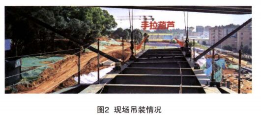 (4)吊裝工具進(jìn)場驗(yàn)收。手拉葫蘆是主要的吊裝工具,手拉葫蘆進(jìn)場前,復(fù)核葫蘆的額定起重量是否滿足要求,查驗(yàn)相關(guān)的合格證和檢驗(yàn)報告。本項(xiàng)目吊裝的懸挑結(jié)構(gòu)單根主梁最大重量11t,考慮一端固定一端懸挑,懸挑端采用額定起重量為10t的手拉葫蘆可以滿足要求。驗(yàn)收進(jìn)場的鋼絲繩直徑是否符合方案的要求,是否有起毛、斷絲、磨損的情況。如果有異常,驗(yàn)收卸扣規(guī)格尺寸等能否滿足吊裝要求用。