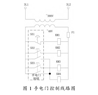 手電門控制電動葫蘆的控制器線路圖如圖1所示,急停開關(guān) SB1 拔起后接觸器 KM1 得電,電動葫蘆動力電上電,SB2 和 SB3 為雙擋按鈕,通過操作按鈕控制電動葫蘆以低速或高速進行上升或者下降運行,手電門通過移動電纜和牽引繩懸掛在葫蘆下方隨葫蘆水平方向一起運行。