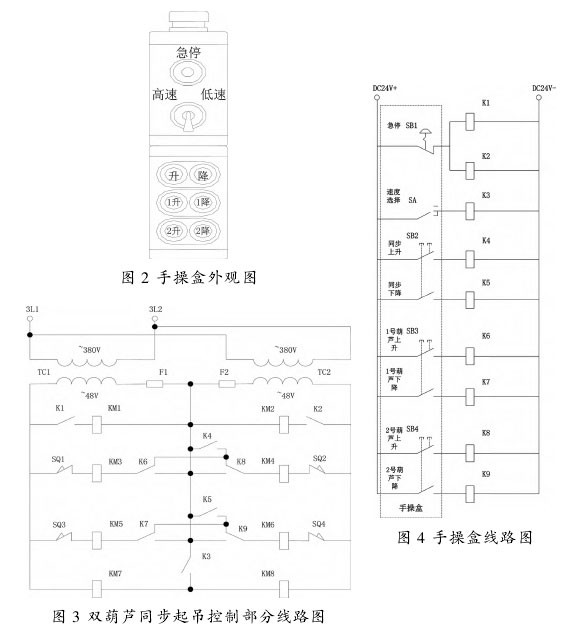 針對環(huán)鏈電動葫蘆的手電門控制和變頻器控制的缺點,在不改變兩臺獨立電動葫蘆機械結(jié)構(gòu)的情況下可利用改造手電門電路的方式控制兩臺環(huán)鏈電動葫蘆,用以實現(xiàn)雙吊點同步起吊工作,即用一個手操盒控制兩臺葫蘆同步完成上升或下降動作。 對兩臺電動葫蘆的控制進行改造,手操盒以及部分電路圖見圖 2—圖 4。