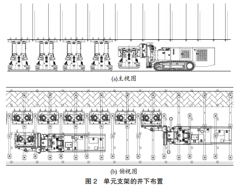 在沿空留巷工作面,單元支架通常布置在工作面后部,可以給脫模后墻體提供臨時(shí)保護(hù),能夠保證在墻體凝固到一定強(qiáng)度前不承接頂板壓力。為防止反復(fù)撐頂破壞頂板,單元支架的移動(dòng)采用無反復(fù)支撐的方式。撤除時(shí),采用專用搬運(yùn)車將最后面的支架移至最前面,保證留巷頂板完好。單元支架在井下工作面的布置如圖 2 所示。