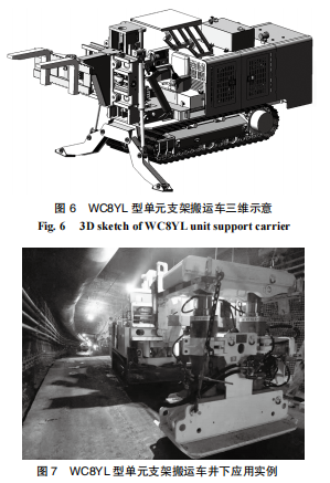 為提高單元支架的搬運(yùn)效率,聯(lián)合專業(yè)廠家研發(fā)了 WC8YL 型單元支架專用搬運(yùn)車,并已在神東集團(tuán)錦界煤礦、新汶集團(tuán)內(nèi)蒙能源長城三礦、陜西麟北煤業(yè)園子溝煤礦等多家煤業(yè)公司成功應(yīng)用。WC8YL 型單元支架搬運(yùn)車三維示意及井下應(yīng)用實(shí)例如圖 6、7 所示。