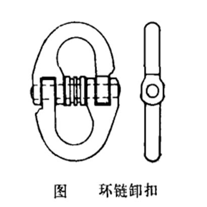圖中a是U型帶鎖緊螺母卸扣,適于在高處或不易發(fā)現(xiàn)其松脫處使用;b為馬蹄形卸扣,具有較大的環(huán)腔;c是帶滾輪卸扣;d是長環(huán)腔卸扣,適合于不同的使用條件。國外還應(yīng)用一種適合于鏈條作業(yè)用的卸扣,下圖是瑞典公司生產(chǎn)的鏈環(huán)卸扣,用它可以靈活地調(diào)整鏈條索具的分支或更換夾具。