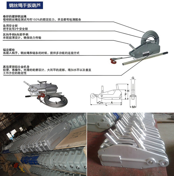 SM鋼絲繩手扳葫蘆機(jī)殼采用高強(qiáng)度優(yōu)質(zhì)鋁合金壓鑄而成,配套使用的鋼絲繩具有特別高的破斷拉力和耐磨性,根據(jù)客戶需要配置相適合的鋼絲繩長度。主要給個(gè)為800公斤、1600公斤、3200公斤。適用于工廠、礦山、建筑工地、碼頭、運(yùn)輸?shù)雀鞣N場合,是設(shè)備安裝、貨物起吊、物體固定、綁扎和牽引的理想工具,尤其是任意角度的牽引和在場地狹小,露天作業(yè)和無電源的情況下,更顯示其優(yōu)越性。本產(chǎn)品嚴(yán)格按國家3包執(zhí)行,產(chǎn)品質(zhì)量由中國人民保險(xiǎn)公司(PICC)承保,請放心使用。