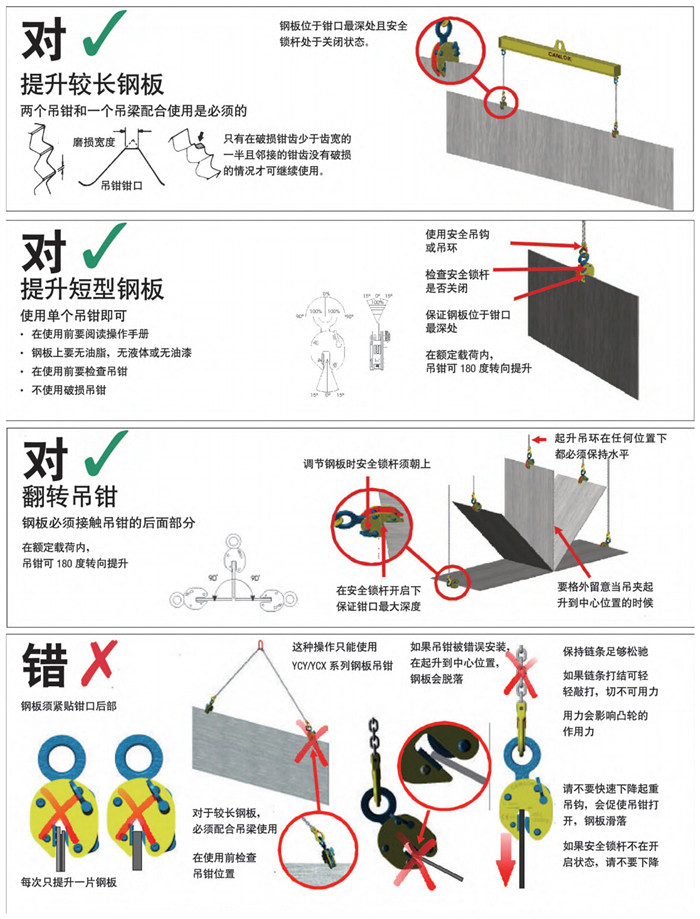 CDH型豎吊起重鉗適用于鋼板豎直吊裝,此種鋼板吊鉗采用首鋼低碳優(yōu)質(zhì)合金鋼制造,載荷范圍為0-10噸。它只能同時吊裝一塊鋼板,嚴禁層疊吊裝。吊鉗起 吊時必須將拉環(huán)手柄向上,以使彈簧拉緊,卸荷時拉環(huán)手柄向下,彈簧放松后簽字和鋼板才能分離,且吊裝過程中不得碰撞被吊物,嚴禁超載使用。帶彈簧鎖無作業(yè) 狀態(tài)下,鎖具自然加緊,吊上物體夾力成比例增強。本產(chǎn)品嚴格按國家3包執(zhí)行,產(chǎn)品質(zhì)量由中國人民保險公司(PICC)承保,請放心使用。